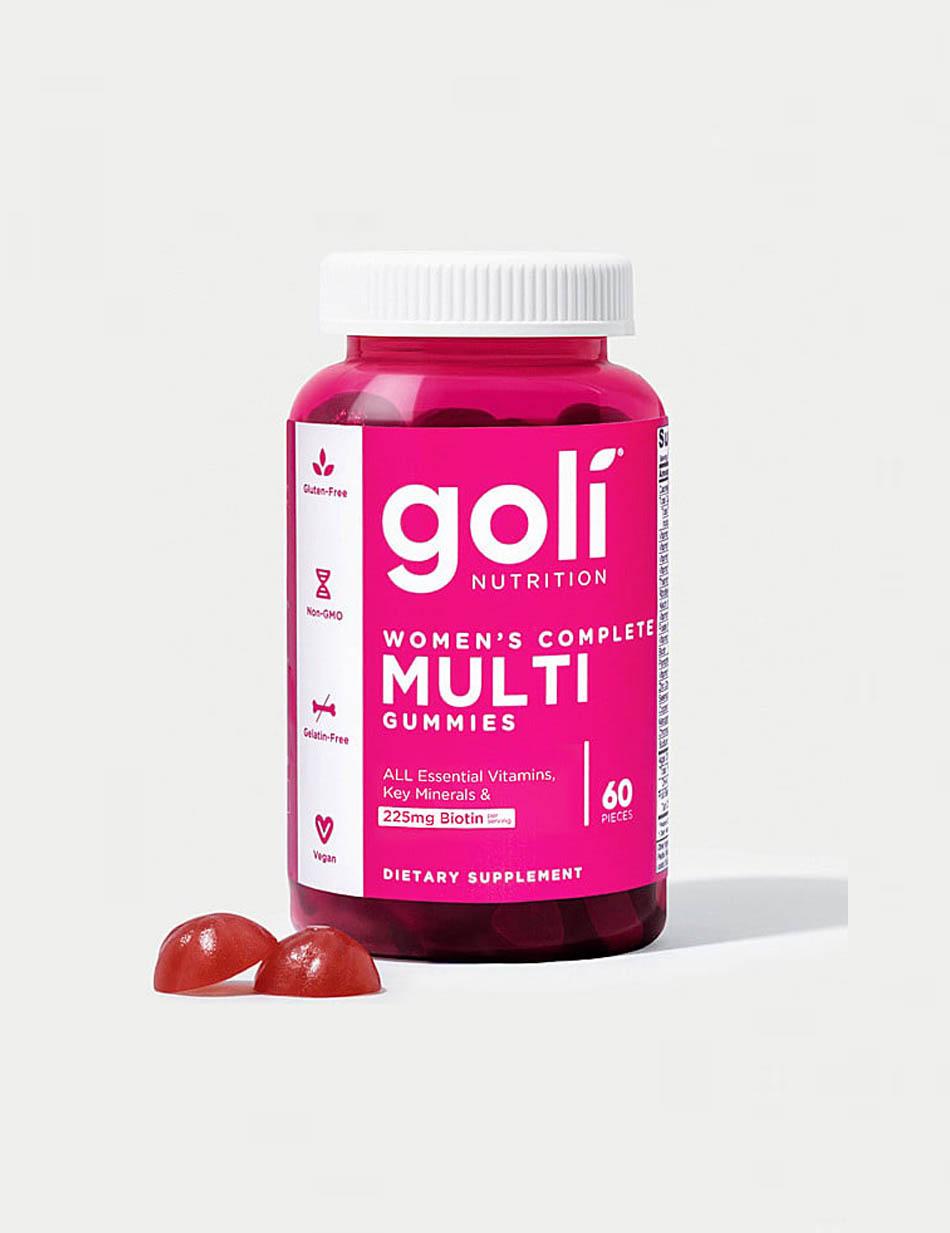 Goli®️ Les multi-Gummies complètes des femmes contiennent de la biotine pour soutenir des cheveux, une peau et des ongles sains.