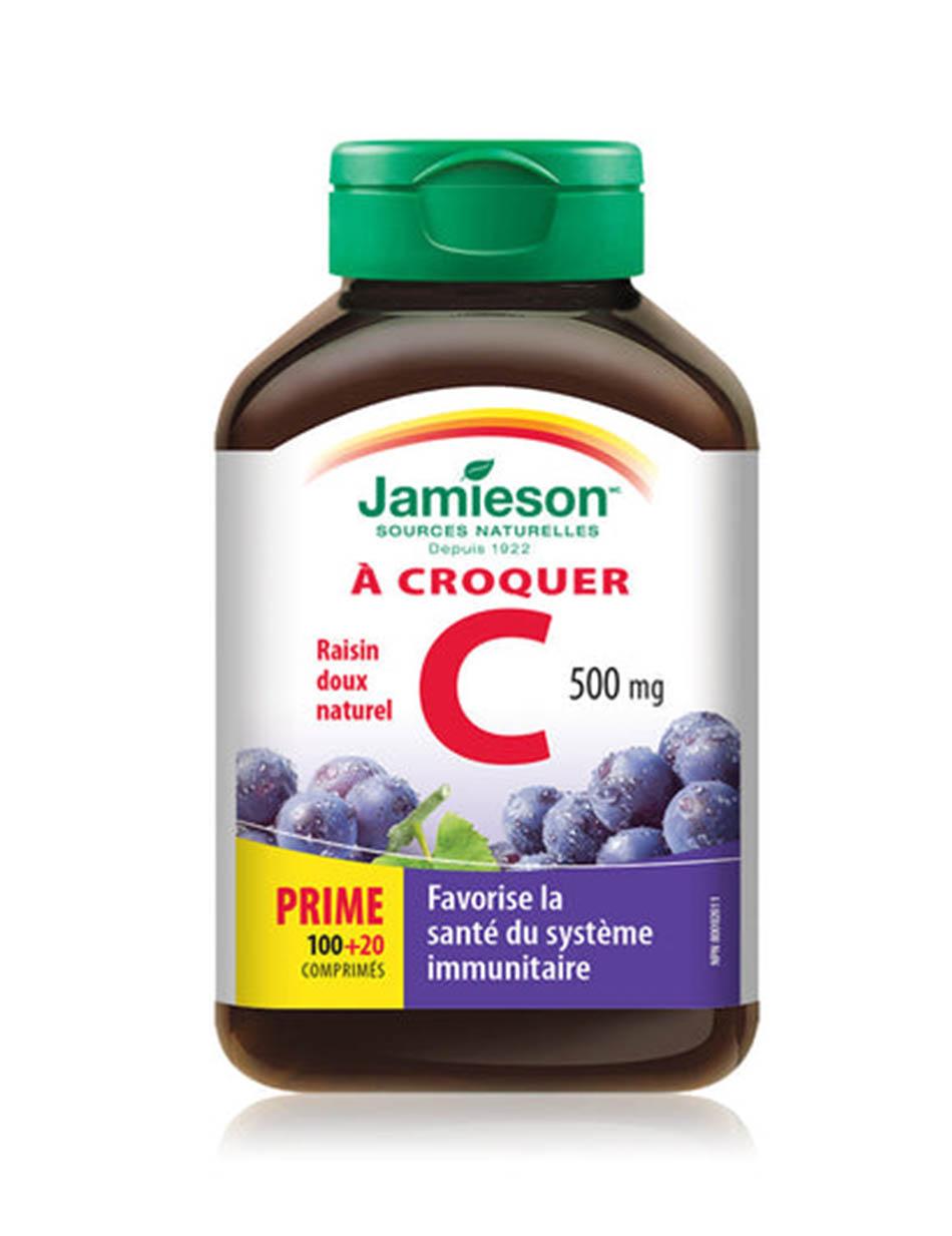Jamieson Vitamine C 500mg fruits à croquer 100 + 20comp est un complément alimentaire sous forme de comprimés à croquer qui contribue à renforcer le système immunitaire grâce à sa teneur élevée en vitamine C. Les comprimés ont un goût agréable de fruits.